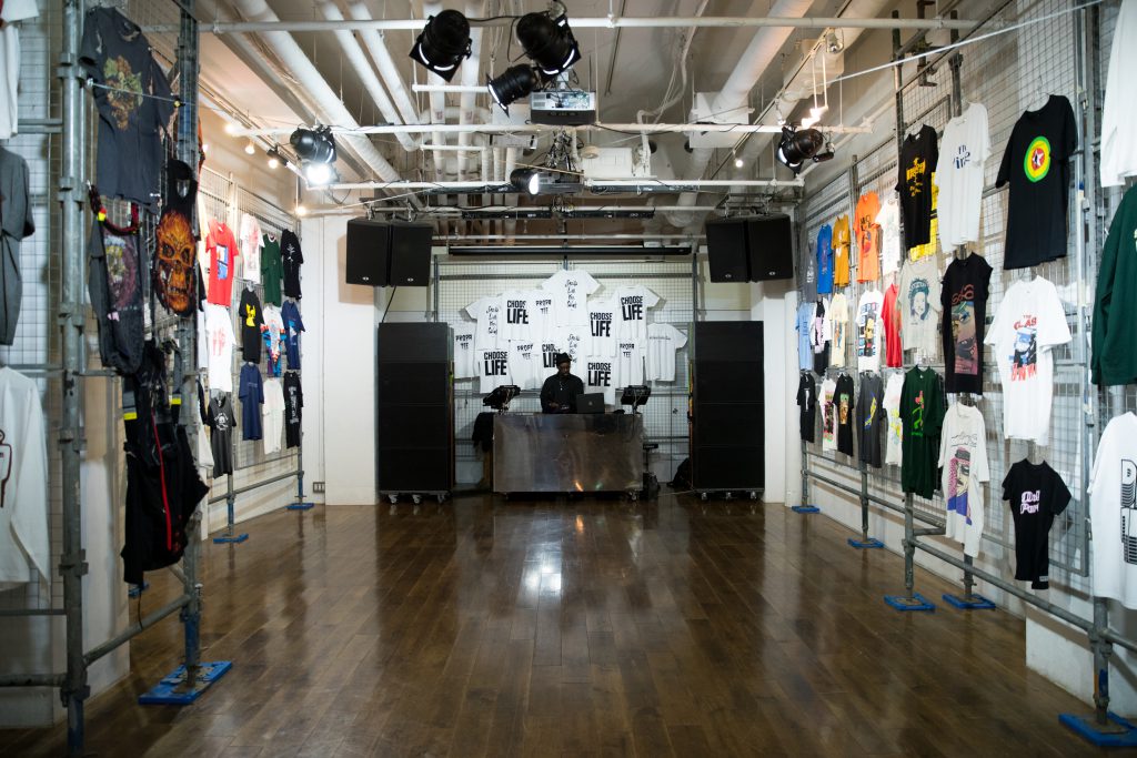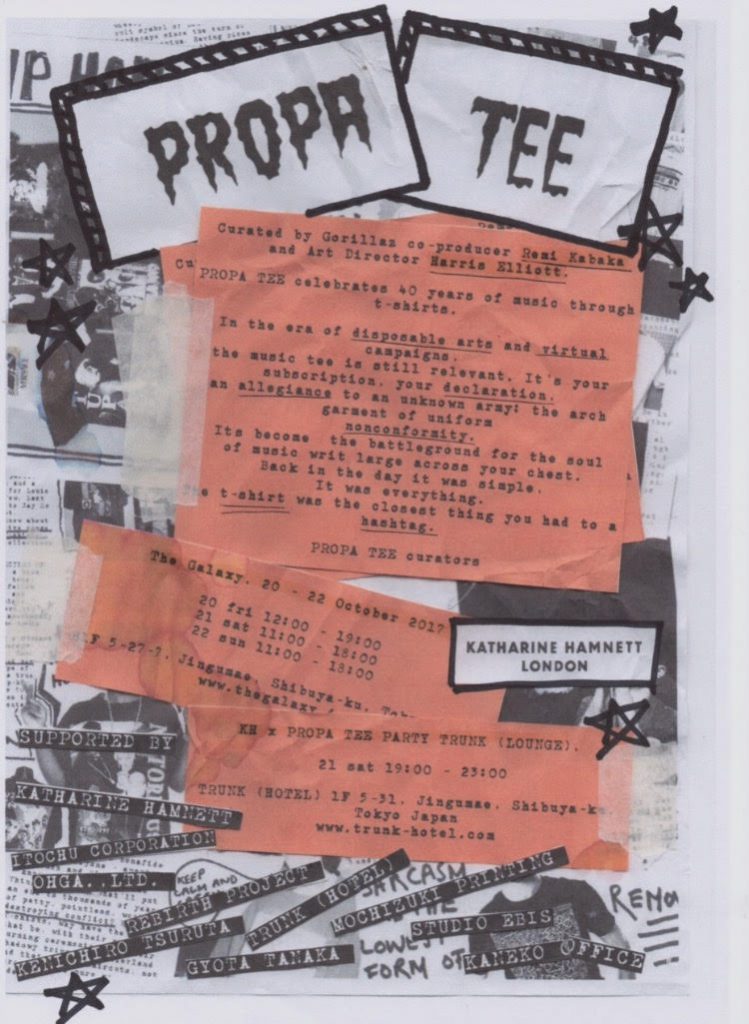 of T-shirts from various personal collections. In addition, the Tokyo exhibition served as the stage for a new T-shirt collaboration between iconic British fashion designer Katharine Hamnett, known for her infamous “Choose Life” T-shirt and being one of the catalysts for slogan T-shirts in general and Propa Tee.